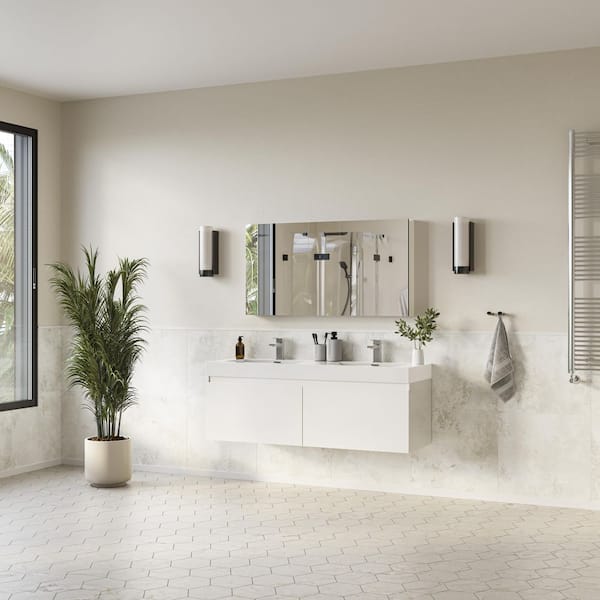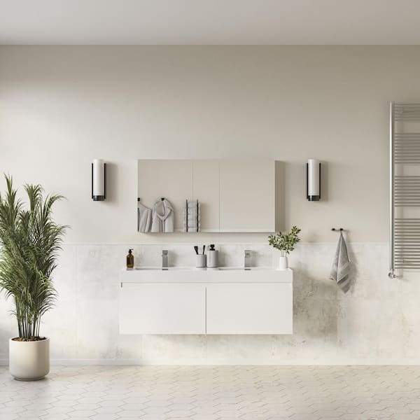 Mezzo 59 in. Vanity in White with Acrylic Vanity Top in White with White Basins and Mirrored Medicine Cabinet