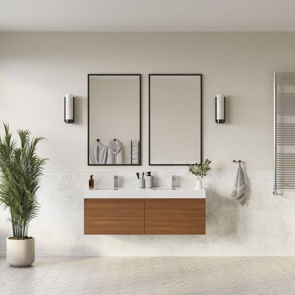 Mezzo 60 in. Modern Wall Hung Bath Vanity in Teak with Double Vanity Top in White with White Basins