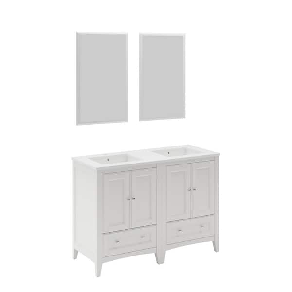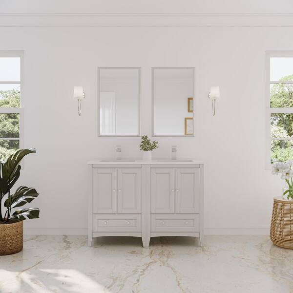 Oxford 48 in. Double Vanity in Antique White with Ceramic Vanity Top in White with White Basins and Mirror