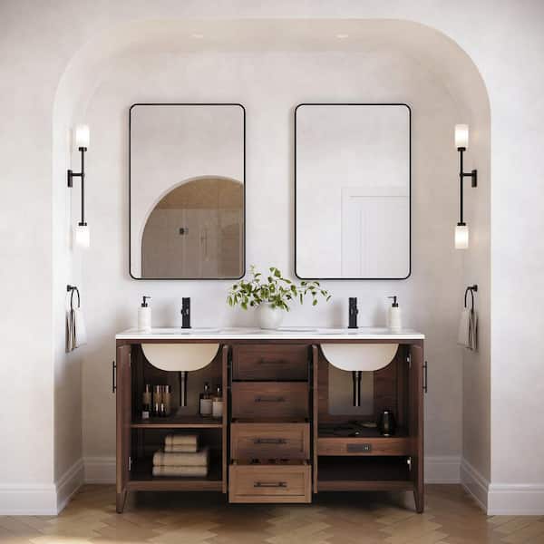 Silas 60 in. Double Sink Freestanding Bath Vanity with White Quartz Top and Ceramic Sink in Warm Walnut