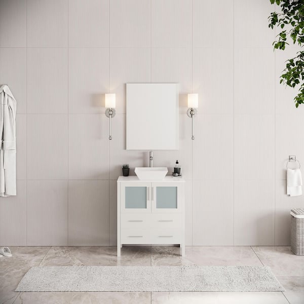 Torino 30 in. Vanity in White with Glass Stone Vanity Top in White and Mirror (Faucet Not Included)