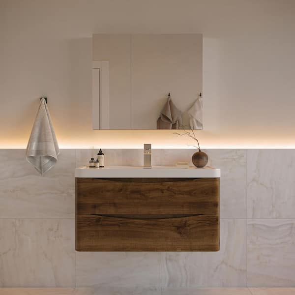 Tuscany 36 in. Modern Wall Hung Bath Vanity in Rosewood with Vanity Top in White with White Basin and Medicine Cabinet