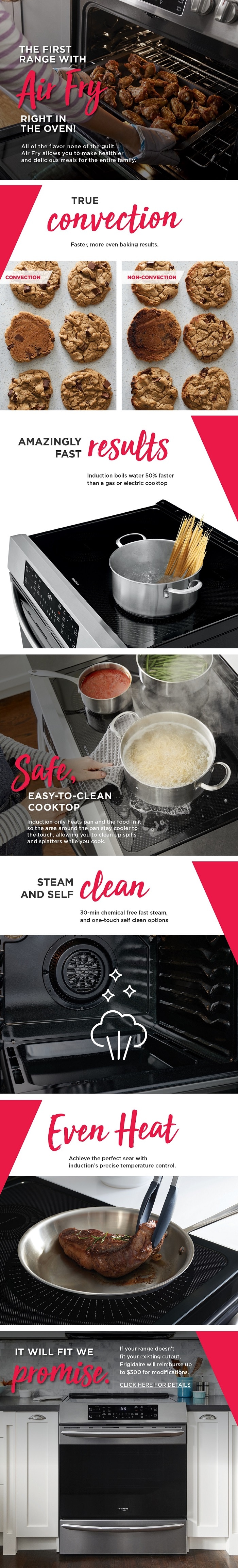 This 30" Frigidaire Gallery Front Control Range is packed with time-saving features like True Convection. An easier to clean Induction Cooktop and Steam Clean. Plus, this range is the first on the market to offer Air Fry, at the touch of a button.