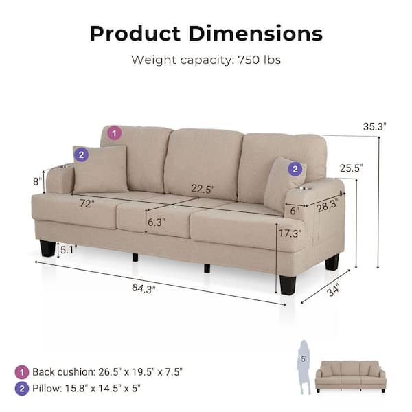 Colby 84.3 in. Track Arm Boucle Fabric Rectangle Small Space Sofa In Beige With USB Ports and Cup Holders