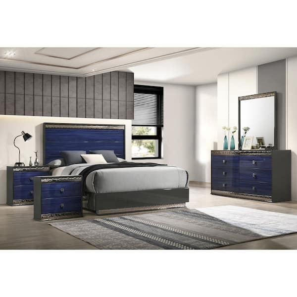 Ellia 5-Piece Ash Gray and Indigo Blue Wood Frame King Platform Bedroom Set with Wooden Panels, Geo Chrome Molding