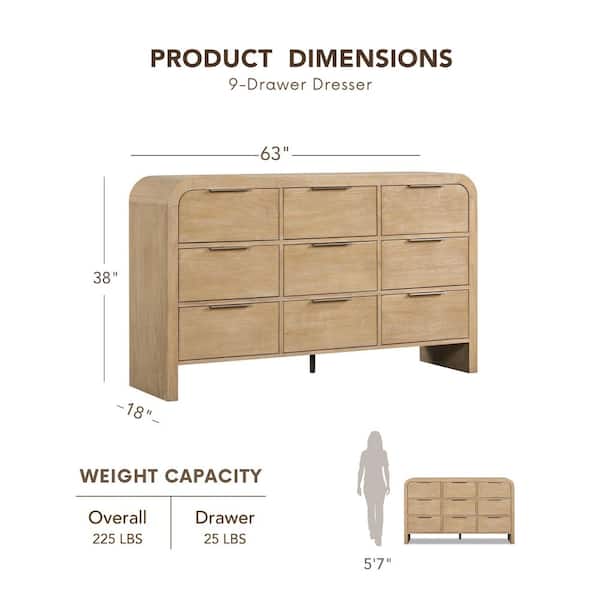Falkner Modern Natural Wood 9 Drawer 63 in. Wide Dresser