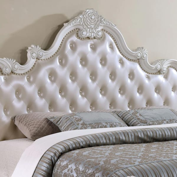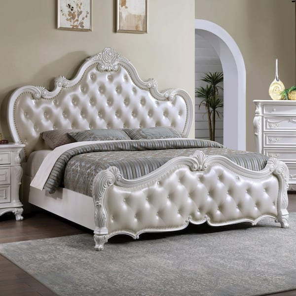 Feliciano White Wood Frame Eastern King Panel Bed with Button Tufted Headboard and Carved Details