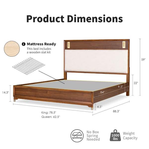 Forma Mid Century Brown Walnut Rubber Wood Frame Queen Platform Bed with Reading Lights