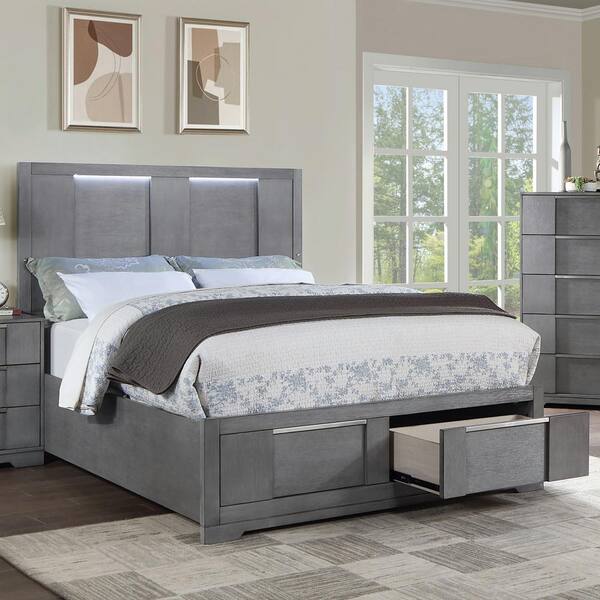 Invern Gray Wood Frame Queen Platform Bed with Lighted Headboard and 2-Drawers