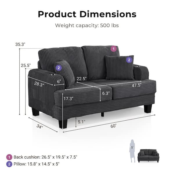 Kasin 60 in. Dark Gray Solid Chenille Rectangle 2-Seater Small Space Loveseat With Cup Holders