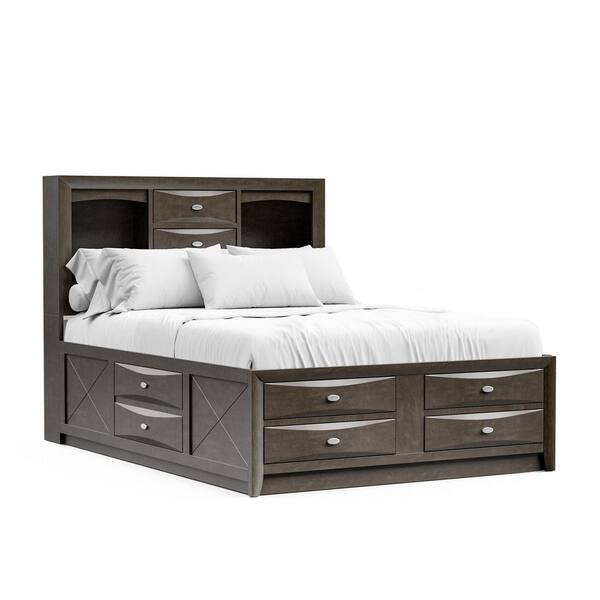 Lanten 6-Piece Gray Wood Frame Queen Platform Bedroom Set with Footboard and Side Rail Drawers, Headboard Bookcase