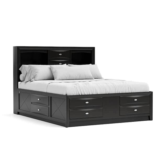 Lanten Black Wood Frame King Platform Bed with Footboard Drawers, Side Rail Drawers and Headboard Bookcase