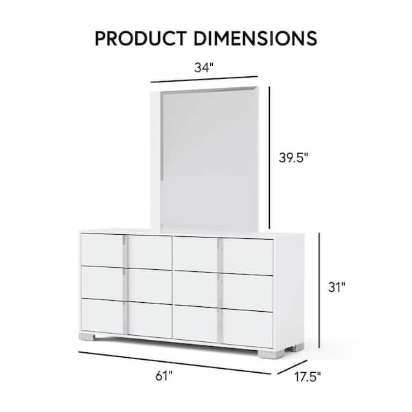 Mesala White 6-Drawer 61 in. Dresser with Mirror with Chrome Accents and Legs, Vertical Chrome Handles