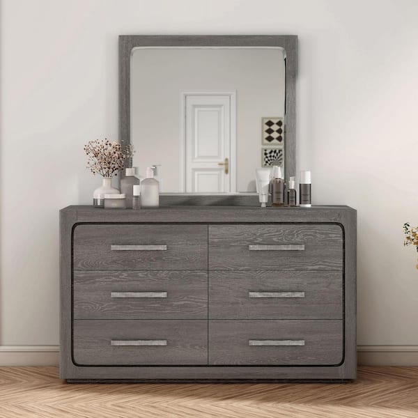 Rally Gray 6-Drawer 62 in. Dresser with Mirror with Felt-Lined Top Drawer, Jewelry Tray and Rounded Edges