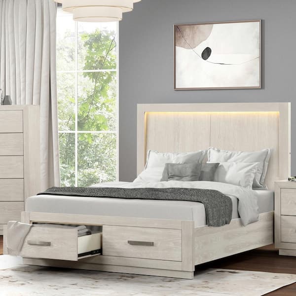 Rantate Gray Wood Frame Queen Platform Bed with LED on Headboard and Footboard Drawers