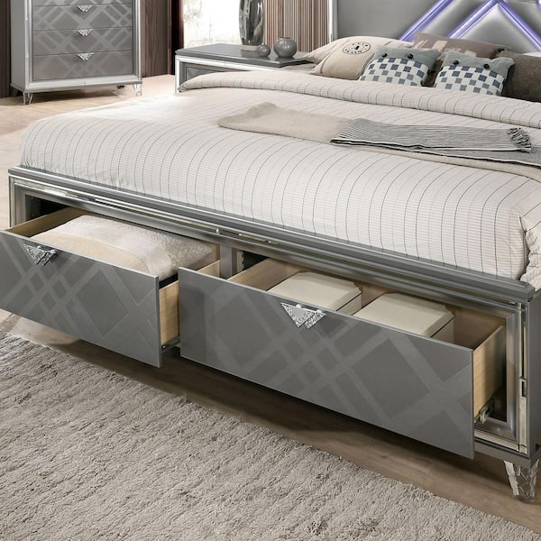 Rusconi Silver Wood Frame King Platform Bed with Lighted Headboard and 2-Foot Drawers