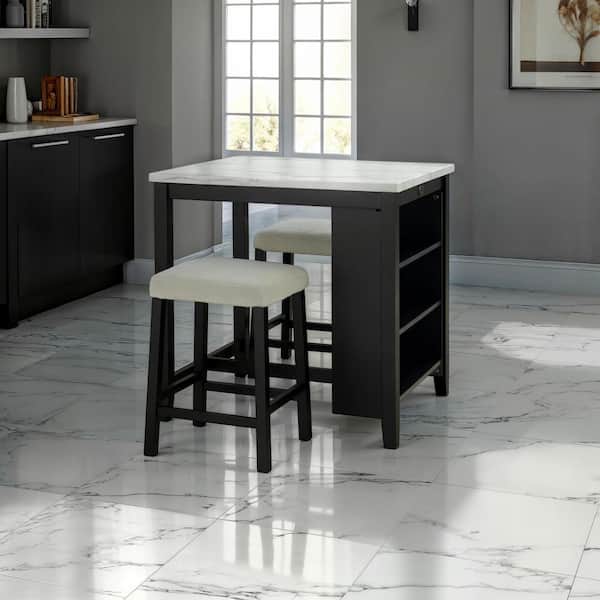 Surren 3-Piece Rectangular Black Wood Top Dining Room Set with USB Charging Ports (Seats 2)