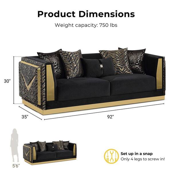 Ulinon 92 in. Track Arms Zebra Print Fabric Sofa in Black Velvet and Gold Trim with Tight Back