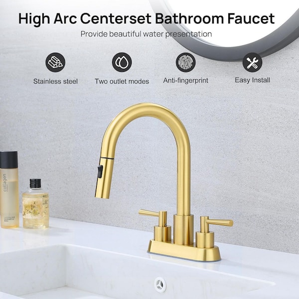 4 in. Centerset Double Handle High Arc Bathroom Sink Faucet with Pull Out Sprayer and Pop Up Drain in Brushed Gold