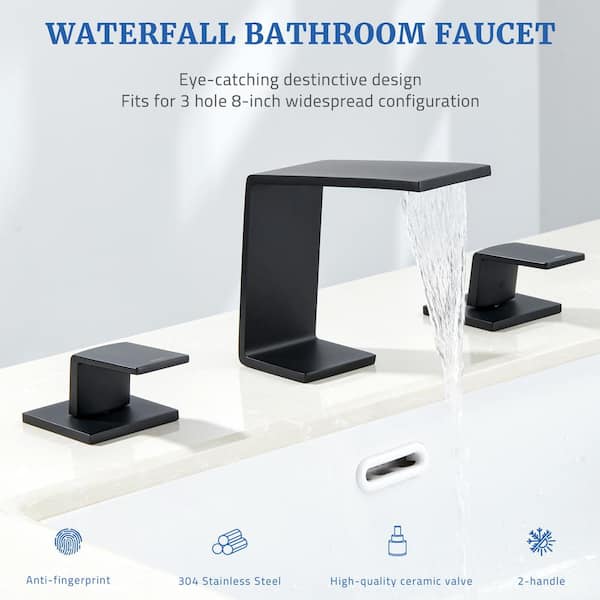 8 in. Widespread Double Handles Waterfall Spout Bathroom Faucet with Pop Up Drain Kit in Matte Black