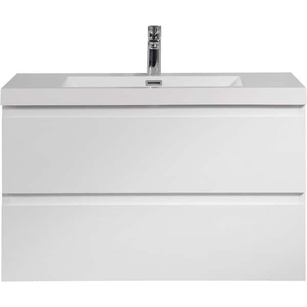 Oasis 35.4 in. Modern Wall-Mounted Floating Glossy White Bath Vanity with White Resin Top, Drawers, MDF