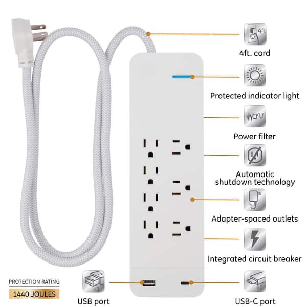 7-Outlet 1 USB-A 1 USB-C Surge Protector with 4 ft. Braided Cord, White