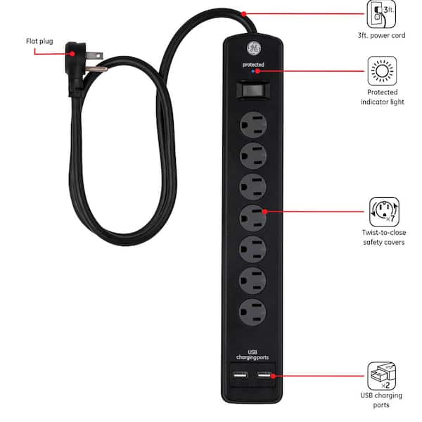 • 7 protected outlets, 2 USB ports, 3 ft. extension cord