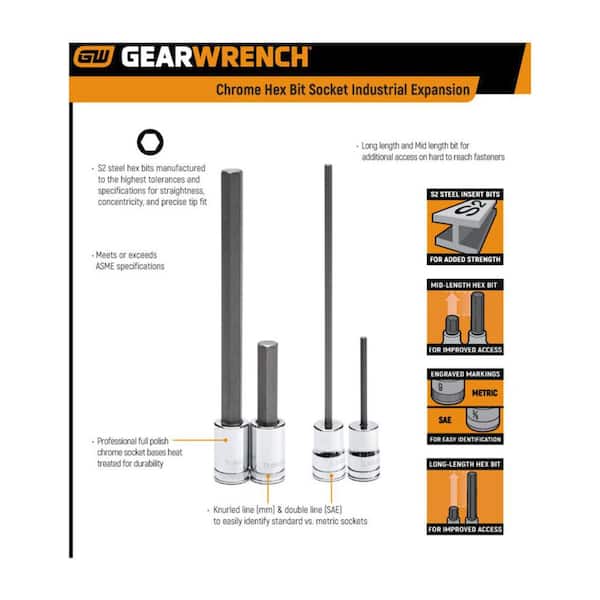 • 7-piece 1/2" drive mid-length hex bit socket set in metric sizes