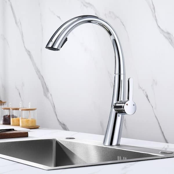 Single Handle Pull Out Kitchen 16.5 in Faucets 360° Swivel Spout, Silver Chrome
