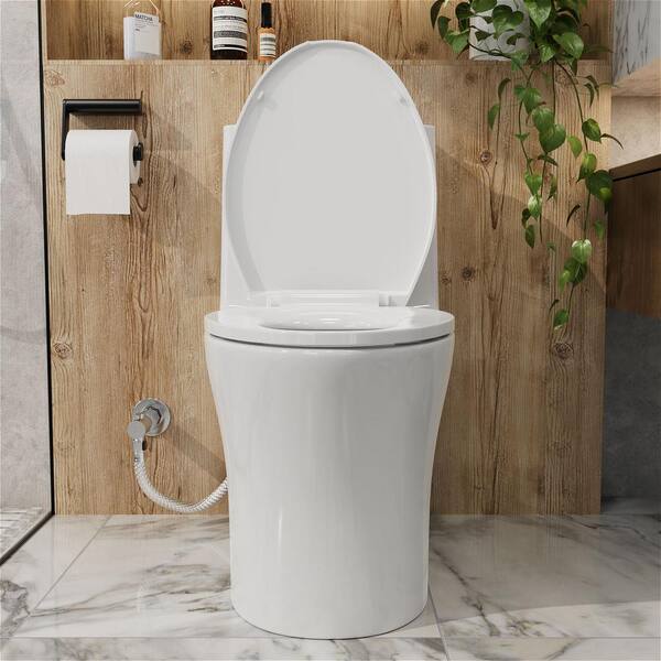 1-piece 1.6 GPF Dual Flush Elongated High Efficiency Toilet in Glossy White with Slow Closed Seat