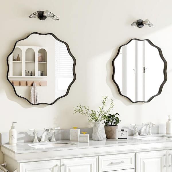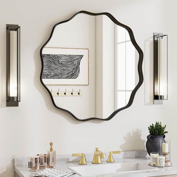 24 in. W x 24 in. H Round Decorative Wave-Edge Black Metal Deep-Framed Wall Bathroom Vanity Mirror