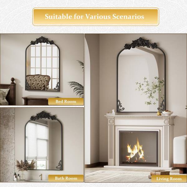 26 in. W x 41 in. H Arched Black Metal Framed with Carved Decoration Wall Mirror Vanity Mirror