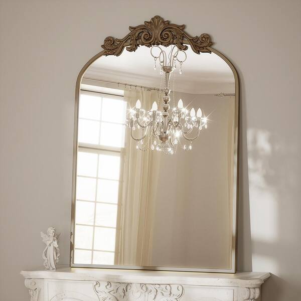26 in. W x 41 in. H Arched Bronze Metal Framed with Carved Decoration Wall Mirror Bathroom Vanity Mirror