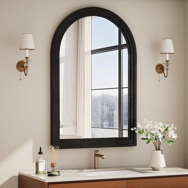 30 in. W x 39.8 in. H Arched Wooden Framed Black Wall Bathroom Vanity Mirror