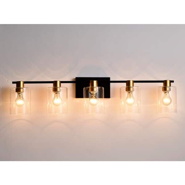 37.4 in. 5-Light Matte Black and Matte Gold Bathroom Vanity Light with Clear Glass Shade