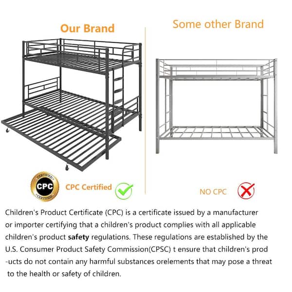 Black Twin Over Twin Metal Bunk Bed with Trundle with Removable Ladder, Comfortable Rungs, Heavy Duty, Easy To Assemble