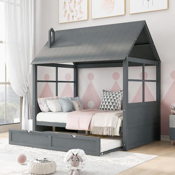 Gray Full Size Wood House Bed with Twin Size Trundle, Wooden Daybed