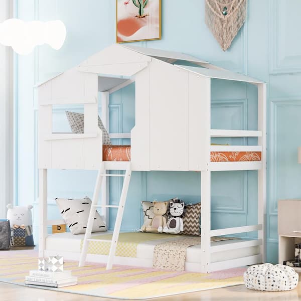 White Twin Over Twin House Bunk Bed with Ladder, Wood Bed