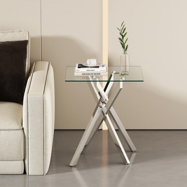 1 Piece 17.72 in. Square Clear Tempered Glass End Table with Silver Metal Legs, Modern Living Room Side Table