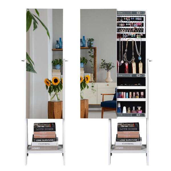 14 in. W x 15.7 in. L x 60 in. H White MDF Free Standing Jewelry Armoire with Mirror, Slide Rail and Shelve