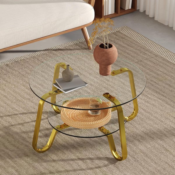 31.5 in. Round Clear Tempered Glass Coffee Table-Double Storage Space and Gold Metal Legs for Living Room