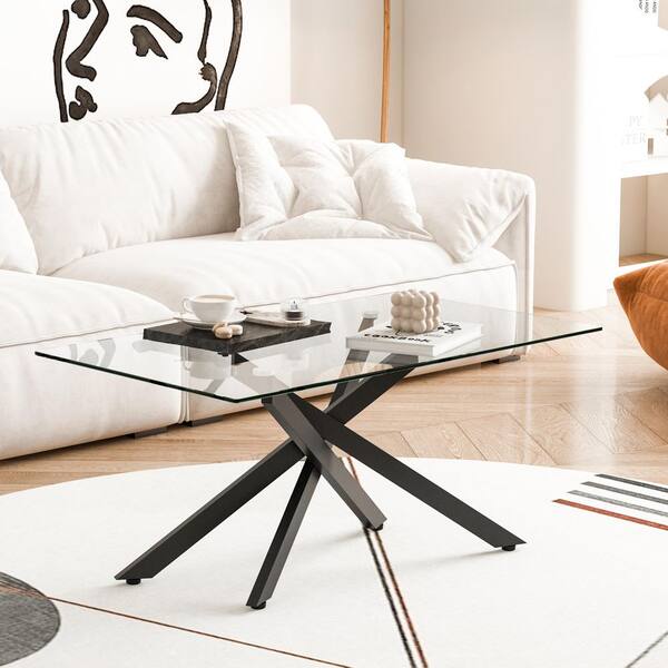 39.37 in. Rectangle Clear Tempered Glass Coffee Table with Black Metal Legs, Modern Living Room Furniture
