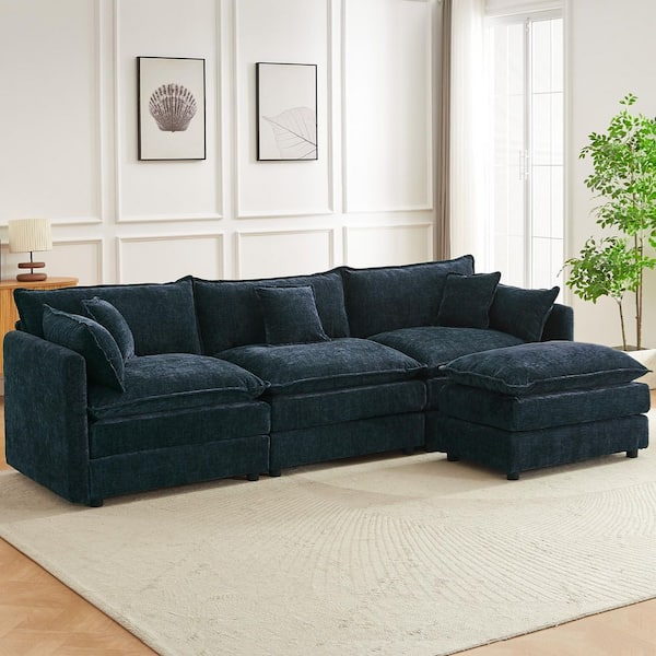 112.2 in. Square Arm L-Shaped Chenille Deluxe Pillow-Styled Modular Sectional Sofa in. Blue with 1 Ottoman