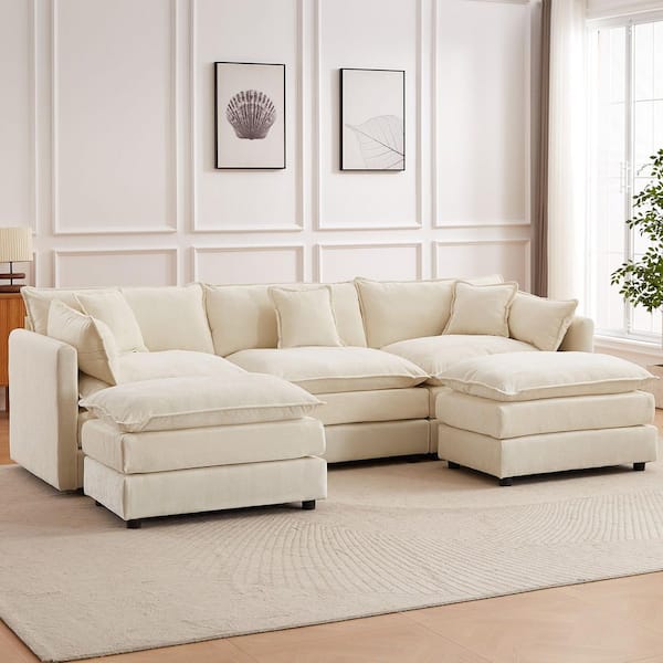 112.2 in. Square Arm U-Shaped Chenille Deluxe Pillow-Styled Modular Sectional Sofa in. Beige with 2 Ottoman