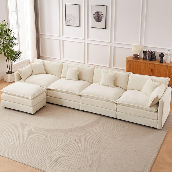 147.2 in. Square Arm L-Shaped Chenille Deluxe Pillow-Styled Modular Sectional Sofa in. Beige with 1-Ottoman