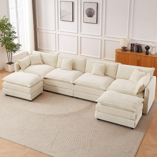 147.2 in. Square Arm U-Shaped Chenille Deluxe Pillow-Styled Modular Sectional Sofa in. Beige with 2-Ottoman