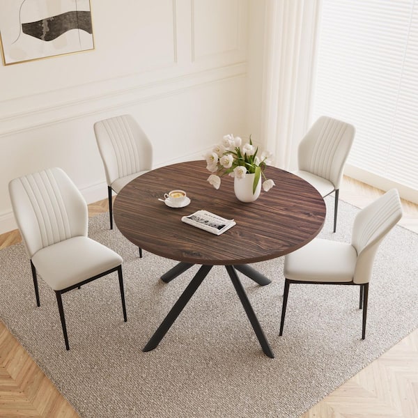 5-Piece Modern Walnut Round Dining Table Set for Dining Coffee Room (Walnut Table+4 White Chairs)