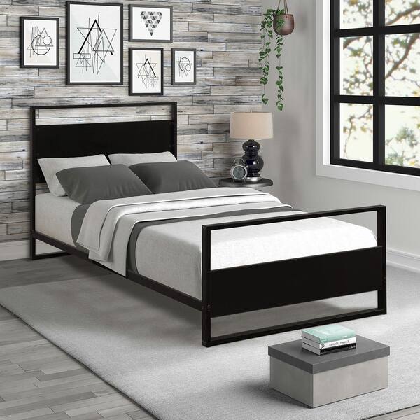 Black Twin Metal and Wood Bed Frame with Headboard and Footboard/Strong Slat Support Industrial Style