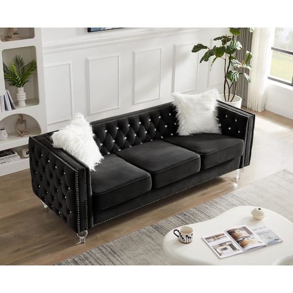 Mid-Century 83 in. Straight Arm Velvet Rectangle Adjustable Headrests Sofa in Black
