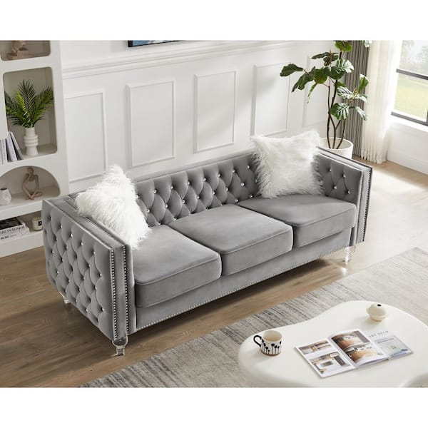 Mid-Century 83 in. Straight Arm Velvet Rectangle Adjustable Headrests Sofa in Gray